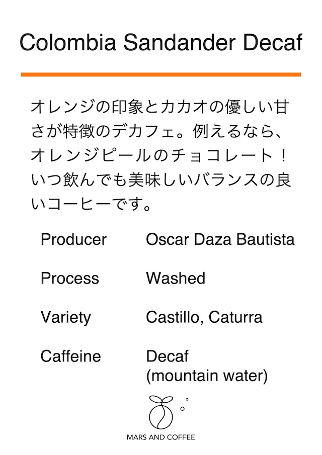 オレンジの爽やかさとカカオのやさしい甘さが調和した、まるで“オレンジピールのチョコレート”のようなデカフェ。店主がベルギー滞在中に出会ったショコラティエの味を思い出す、印象的な一杯です。コロンビアらしい透明感のある酸と甘さが心地よく、デカフェとは思えない満足感をお届けします。いつ誰が飲んでも美味しいコーヒーです。 生産者: Oscar Daza Bautista 生産地: Sandander 標高: 1700-1950m 品種: Castillo, Caturra プロセス: Washed フレーバー: オレンジ、チョコレート、 カフェイン: なし (マウンテンウォータープロセス) ラプラデーラ農園(La Pradera Farm) コロンビア北部・サンタンデール県のアラトカ地区に位置するラプラデーラ農園は、1971年の創業以来、4世代にわたって家族経営を続けてきた歴史ある農園です。現在はオスカル・タザ氏が中心となり、栽培から加工、輸出までを一貫して手がけています。標高1,700m以上の冷涼で乾燥した気候は、高品質なコーヒー栽培に理想的。夜間には近隣のシカモチャ渓谷から吹き込む冷たい風が農園を包み込み、コーヒー豆に複雑なフレーバーをもたらします。農園では年間20kg/本の有機肥料を与え、健全な土壌作りに努めるほか、オークやアボカド、柑橘類など多様なシェードツリーを植えることで、自然と調和した持続可能な栽培を実現。大地の恵みと丁寧な手仕事が詰まった、風味豊かなコロンビアコーヒーを届けています。 デカフェ処理 この商品のデカフェ加工は、メキシコにあるDescamex(デスカメックス)社で行われています。メキシコの最高峰、オリサバ山から流れる綺麗な水を加工に使用していることが特徴です。山からの恵みの水を使用するため、「マウンテンウォータープロセス」とも呼ばれています。まず、コーヒー生豆に含まれているカフェイン以外の成分が溶け込んだ水に、生豆を入れます。すると生豆からカフェインだけが外へ出ていくという現象が起きます。こうして生豆からカフェインだけが取り除かれるという原理です。カフェインの抽出後は、3種類のドライヤーを使い分け、ゆっくりと均一に乾燥させていきます。こうした丁寧な後処理が、急激な乾燥による味の劣化を防ぎ、素材の良さが残ったままのデカフェのコーヒーが出来上がります。